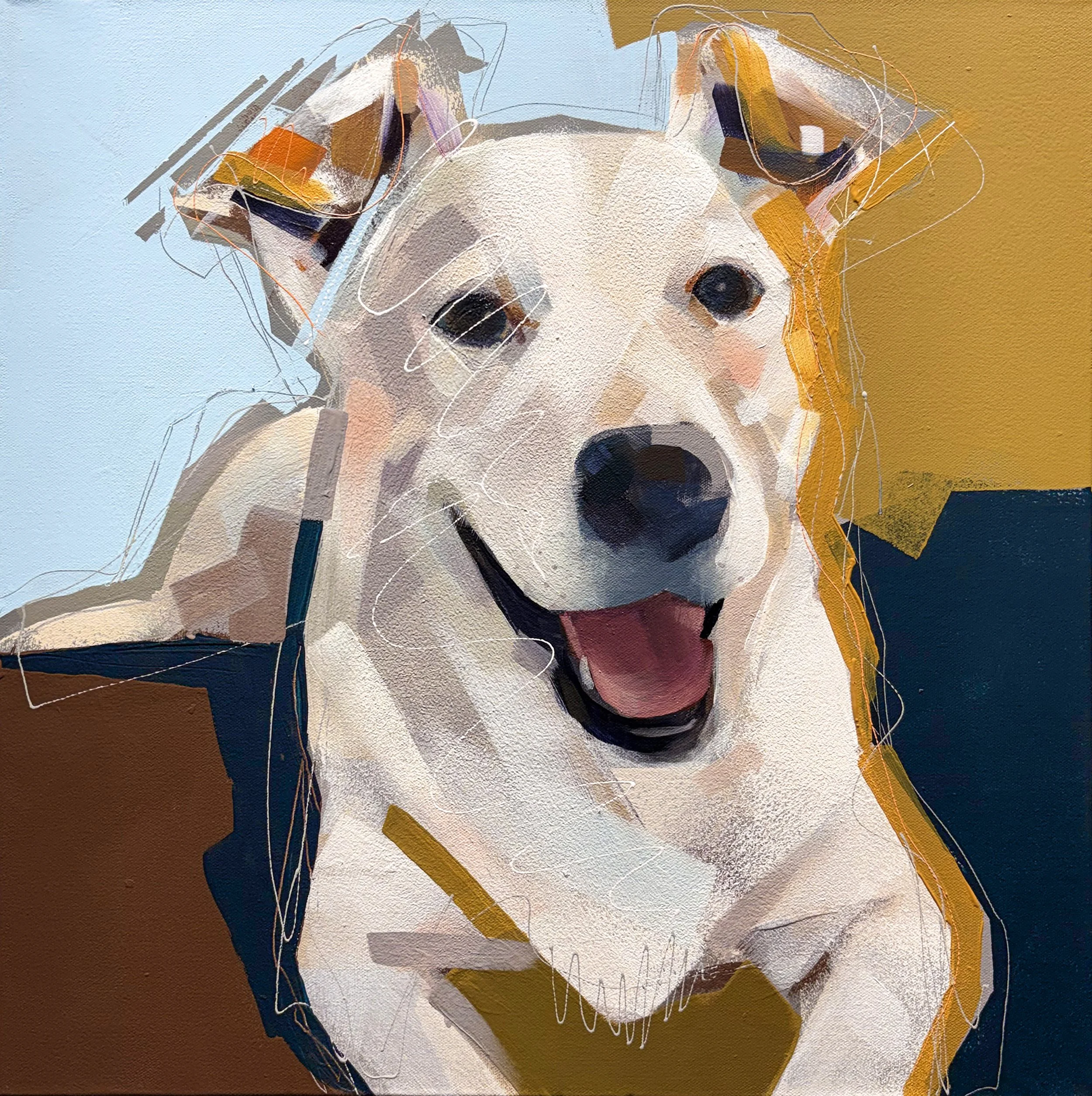 In "A Plea for Treats," I explore the emotive power of abstract art through the lens of a unique canine character, a blend of Labrador, Staffordshire, and Pointer breeds. This painting captures a deeply personal moment — the heartwarming plea of a dog yearning for a snack. By choosing a low angle for the composition, I intended to amplify the dog's imploring gesture, placing viewers in a position that resonates with anyone who has ever been captivated by a pet's earnest request.